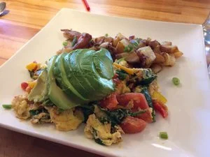 Breakfast: Veggie & Egg Scramble topped with avocado, Roasted Potatoes, and Grapefruit