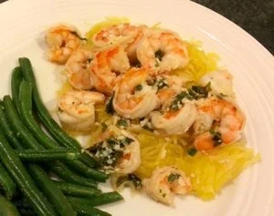 Dinner: Paleo Shrimp Scampi: Prawns (protein), Spaghetti Squash (starch), Garlic & Olive Oil Sauteed Green Beans, and Dandelion Tea Caffe Latte for dessert